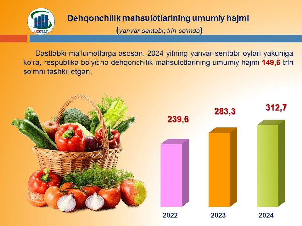 Dastlabki ma’lumotlarga ko‘ra, 2024- yilning yanvar-sentabr oylarida Toshkent viloyati bo‘yicha yalpi hududiy mahsulot hajmi joriy narxlarda