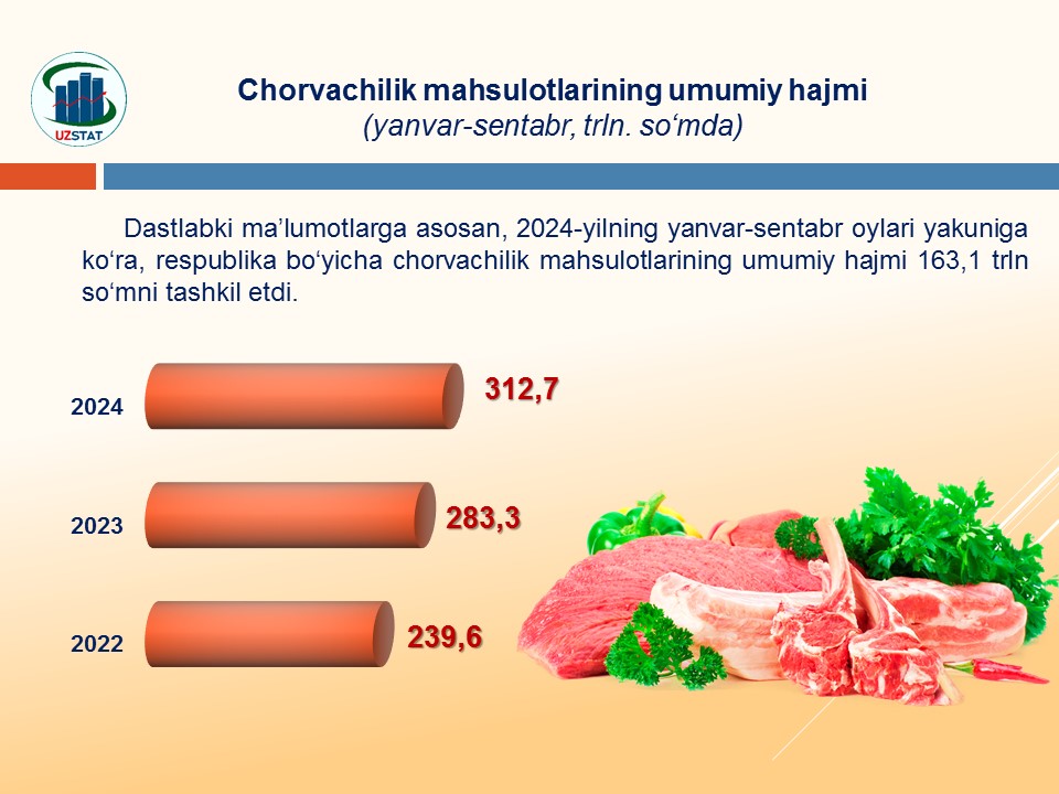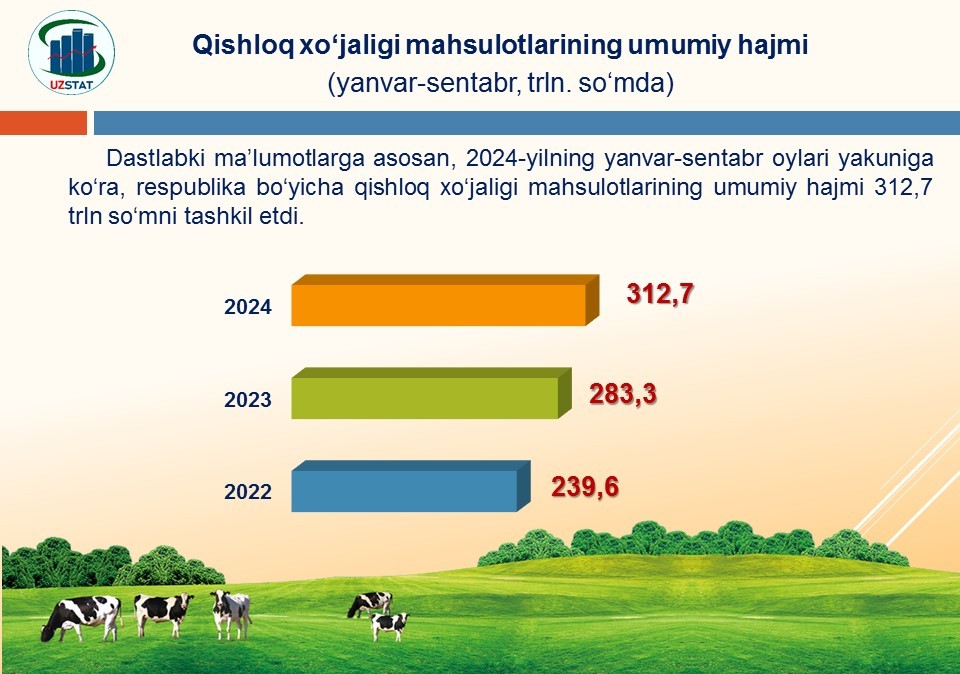 Dastlabki maʼlumotlarga asosan, 2024-yilning yanvar-sentabr oylari yakuniga koʻra, respublika boʻyicha qishloq xoʻjaligi mahsulotlarining umumiy hajmi 312,7 trln soʻmni tashkil etdi