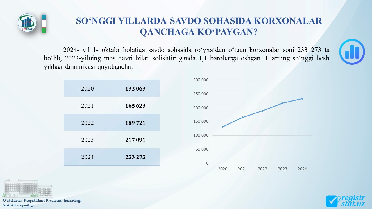 Viloatimizda 2024- yilning 1- oktabr holatiga jami faoliyat ko‘rsatayotgan korxona va tashkilotlar (fermer va dehqon xo‘jaliklarisiz) 42 634 ta bo‘lib