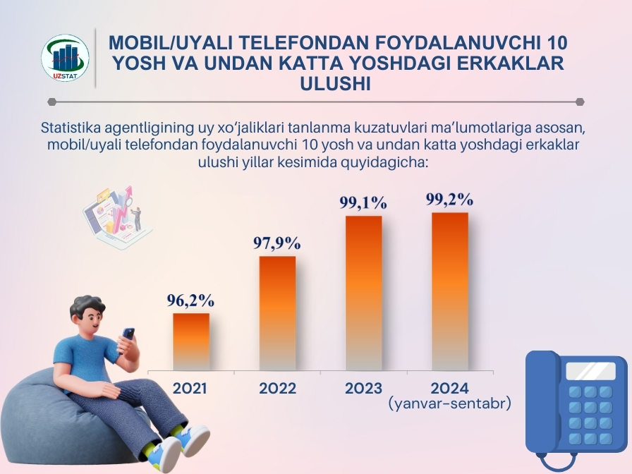 Statistika agentligining uy xo‘jaliklari tanlanma kuzatuvlari ma’lumotlariga asosan, 2024- yil yanvar–sentabr oylarida mobil/uyali telefondan foydalanuvchi 10 yosh va undan katta yoshdagi erkaklar ulushi 99,2 % ni tashkil etgan