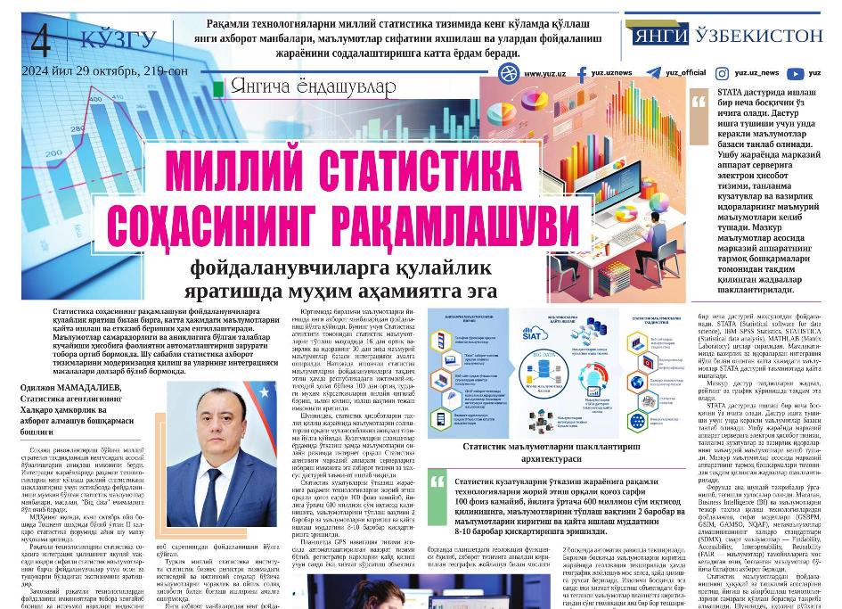 “Yangi O‘zbekiston” gazetasining 2024- yil 29- oktabrdagi 219-sonida Oʻzbekiston Respublikasi Prezidenti huzuridagi Statistika agentligi Xalqaro hamkorlik va axborot almashinuvi boshqarmasi boshlig‘i Odiljon Mamadaliyevning “Milliy statistika sohasining raqamlashuvi foydalanuvchilarga qulaylik yaratishda muhim ahamiyatga ega” nomli maqolasi chop etildi