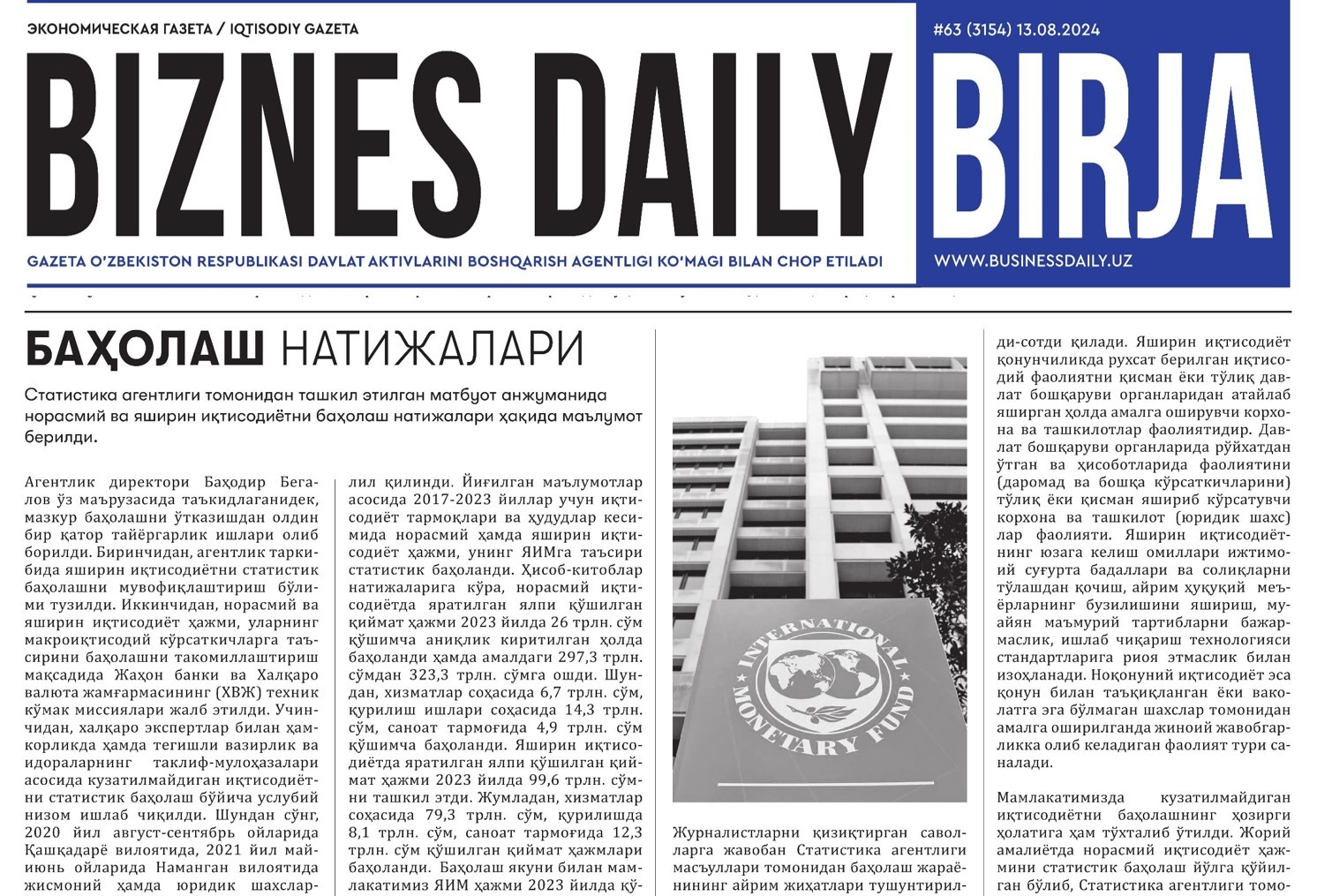 “Biznes Daily Birja” gazetasining 2024-yil 13-avgustdagi 63-sonida “Oʻzbekistonda norasmiy va yashirin iqtisodiyotni baholash natijalari” mavzusida maqola chop etildi