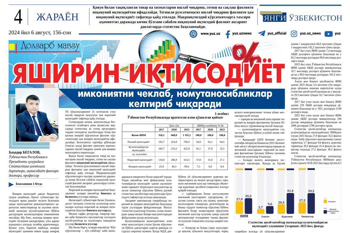 “Янги Ўзбекистон” gazetasining 2024-yil 6-avgustdagi 156-sonida Oʻzbekiston Respublikasi Prezidenti huzuridagi Statistika agentligi direktori, iqtisodiyot fanlari doktori, professor Begalov Baxodir Abdusalomovichning “Yashirin iqtisodiyot imkoniyatni cheklab, nomutanosibliklar keltirib chiqaradi” nomli maqolasi chop etildi