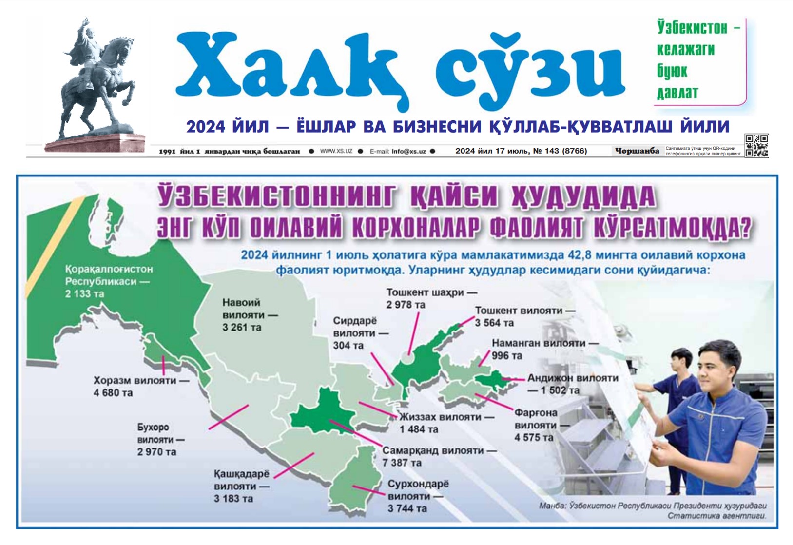 “Халқ сўзи” gazetasining 2024-yil 17-iyuldagi 143-sonida Oʻzbekiston Respublikasi Prezidenti huzuridagi Statistika agentligining maʼlumotlari asosida “Oʻzbekistonning qaysi hududida eng koʻp oilaviy korxonalar faoliyat koʻrsatmoqda” nomli maʻlumot chop etildi
