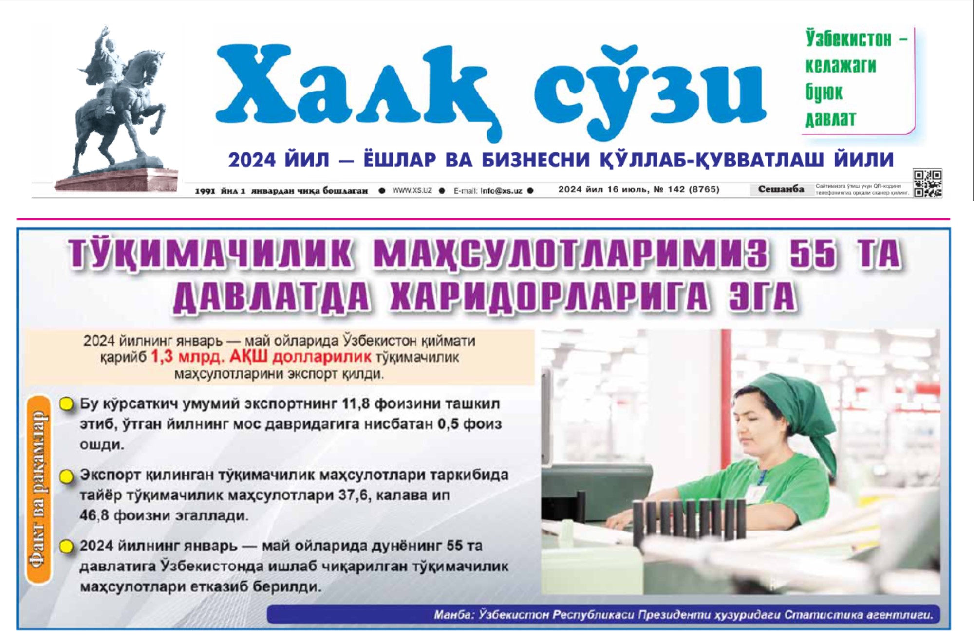 “Халқ сўзи” gazetasining 2024-yil 16-iyuldagi 142-sonida Oʻzbekiston Respublikasi Prezidenti huzuridagi Statistika agentligining maʼlumotlari asosida “Toʻqimachilik mahsulotlarimiz 55 ta davlatda xaridorlariga ega” nomli maʻlumot chop etildi