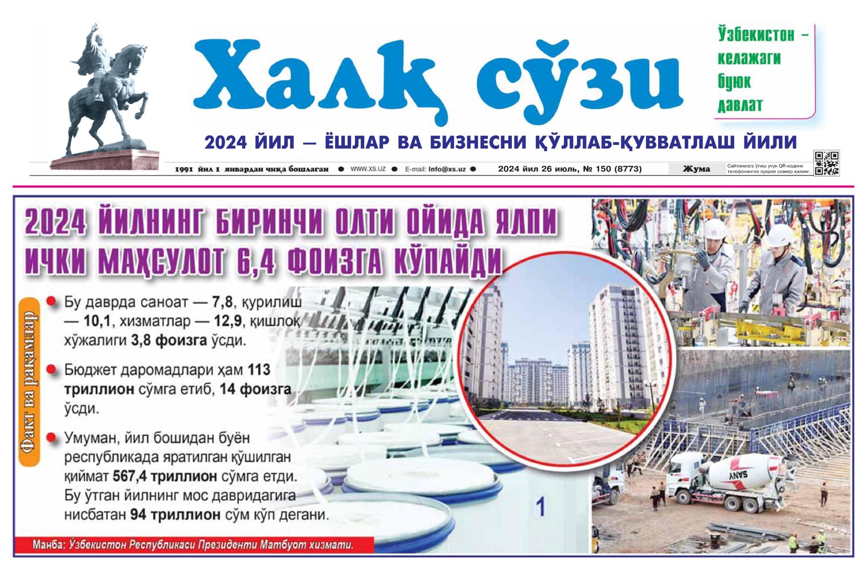 “Халқ сўзи” gazetasining 2024-yil 26-iyuldagi 150-sonida Oʻzbekiston Respublikasi Prezidenti huzuridagi Statistika agentligining maʼlumotlari asosida “2024-yilning birinchi olti oyida yalpi ichki mahsulot 6,4 % ga koʻpaydi” nomli maʻlumot chop etildi