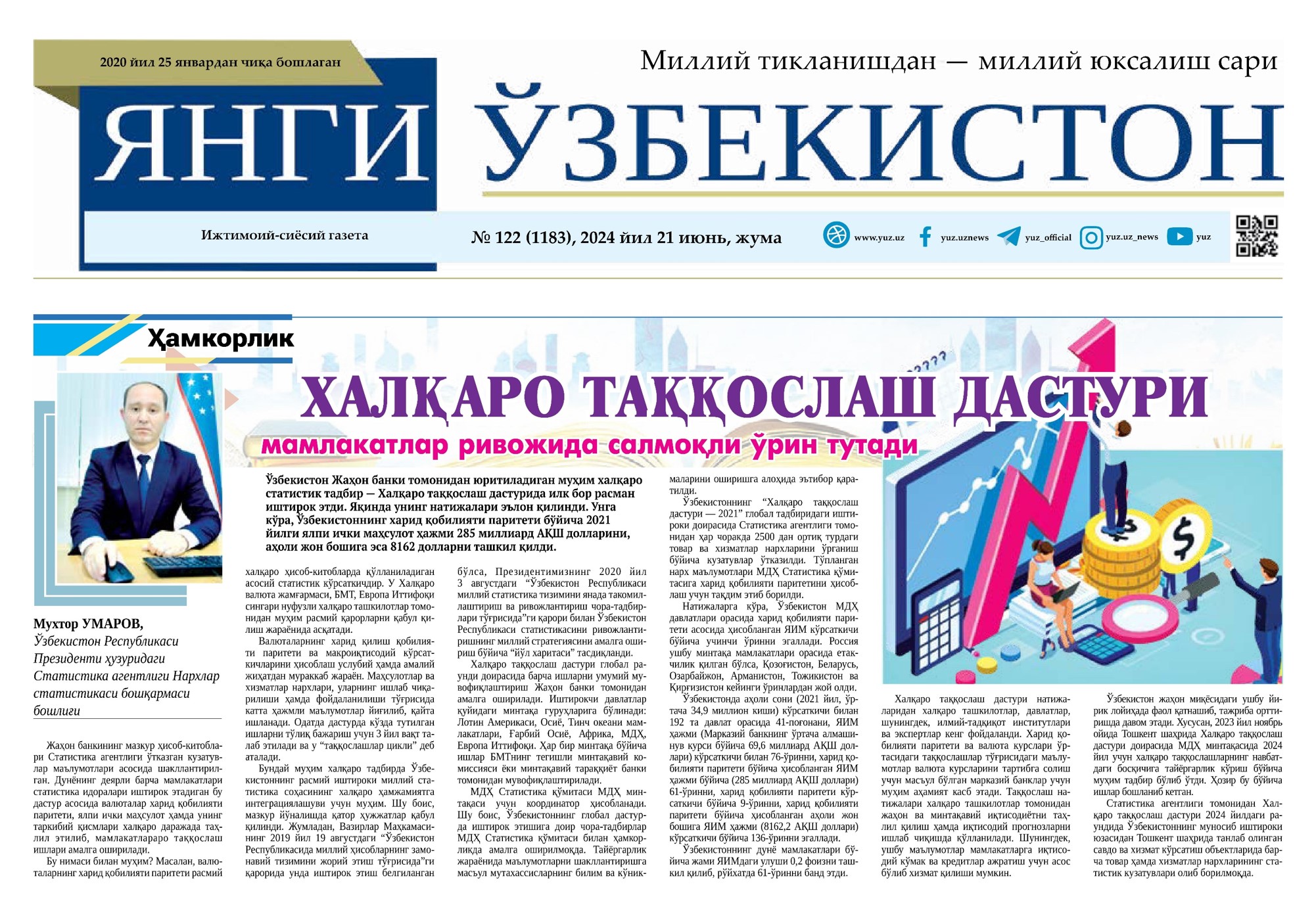 “Yangi Oʻzbekiston” gazetasining 2024-yil 21-iyundagi 122-sonida Oʻzbekiston Respublikasi Prezidenti huzuridagi Statistika agentligi Narxlar statistikasi boshqarmasi boshligʻi Muxtor Umarovning “Xalqaro taqqoslash dasturi mamlakatlar rivojida salmoqli oʻrin tutadi” nomli maqolasi chop etildi