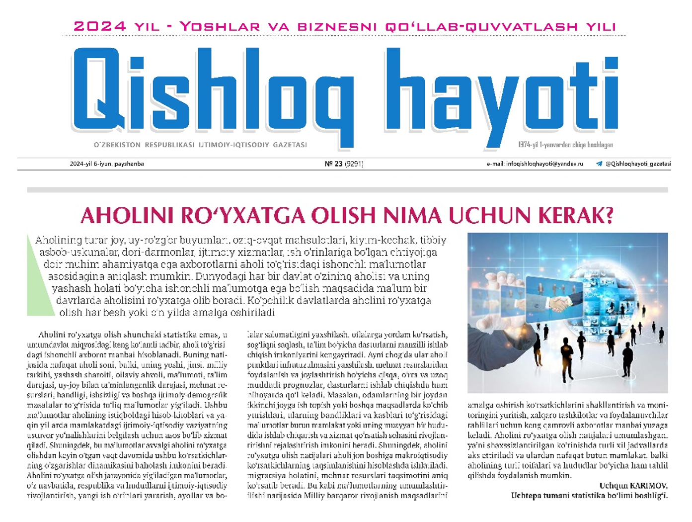 “Qishloq hayoti” gazetasining 2024-yil 6-iyundagi 23-sonida Toshkent shahar Uchtepa tumani statistika boʻlimi boshligʻi Uchqun Karimovning “Aholini roʻyxatga olish nima uchun kerak?” nomli maqolasi chop etildi