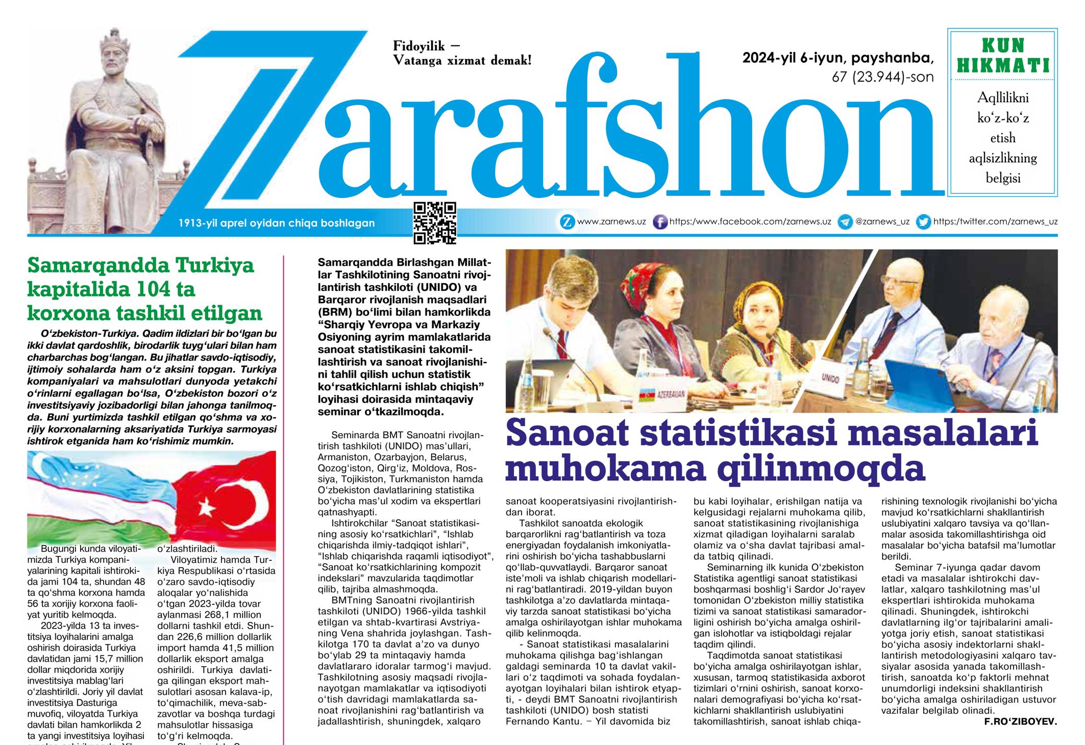 “Zarafshon” gazetasining 2024-yil 6-iyundagi 67-sonida “Sanoat statistikasi masalalari muhokama qilinmoqda” nomli maqola chop etildi