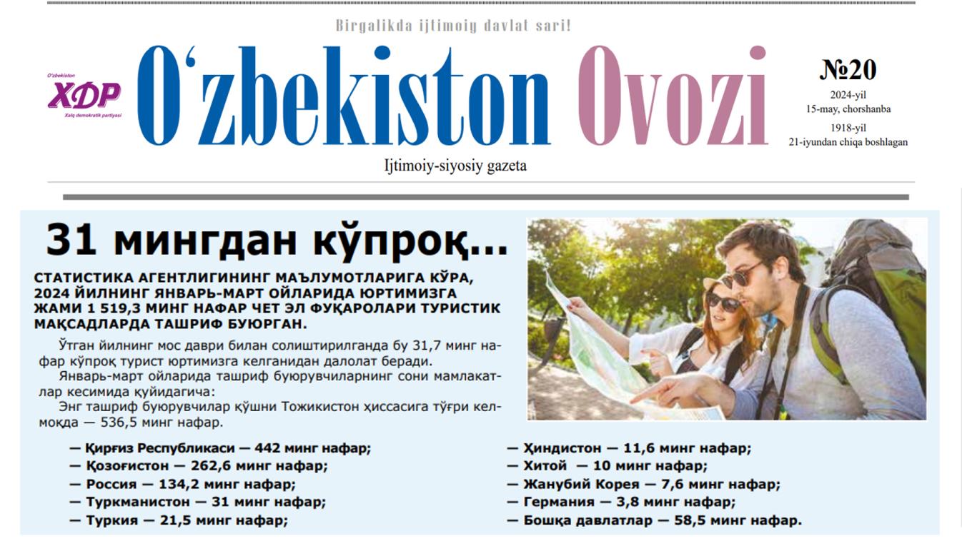 “Oʻzbekiston ovozi” gazetasining 2024-yil 15-maydagi 20-sonida Oʻzbekiston Respublikasi Prezidenti huzuridagi Statistika agentligining turizm statistikasiga oid koʻrsatkichlari eʼlon qilindi