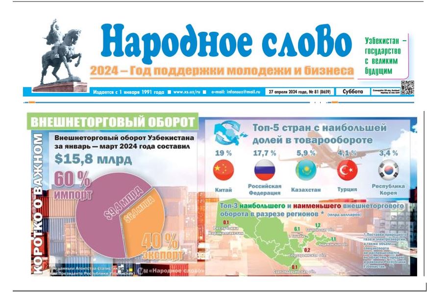 “Народное слово” gazetasining 2024-yil 27-apreldagi 81-sonida Oʻzbekiston Respublikasi Prezidenti huzuridagi Statistika agentligining maʼlumotlari asosida tashqi savdo aylanmasi raqamlarda aks ettirilgan