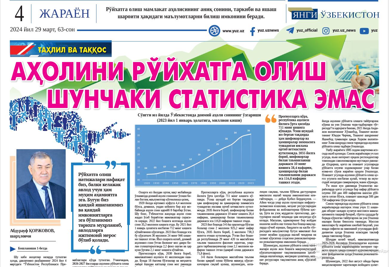“Yangi Oʻzbekiston” gazetasining 2024-yil 29-martdagi 63-sonida “Aholini roʻyhatga olish shunchaki statistika emas” nomli maqola chop etildi