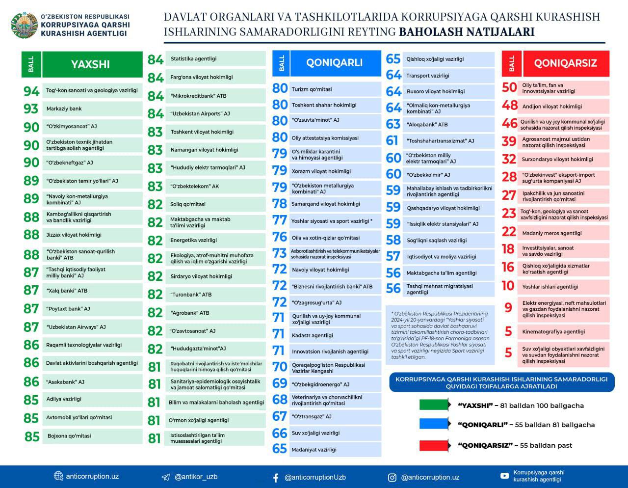 2024-yilning 28-mart kuni Korrupsiyaga qarshi kurashish agentligi va ekspertlar guruhi tomonidan Statistika agentligi tizimida 2023-yil davomida korrupsiyani oldini olish va unga qarshi kurashish boʻyicha amalga oshirilgan ishlar baholandi