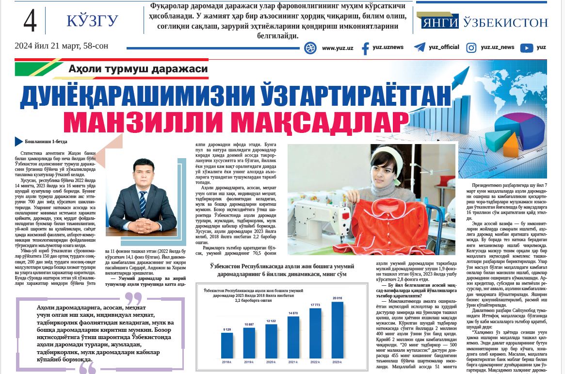 “Yangi Oʻzbekiston” gazetasining 2024-yil 21-martdagi 58-sonida Oʻzbekiston Respublikasi Prezidenti huzuridagi Statistika agentligi Aholi turmush darajasi va kuzatuvlari statistikasi boshqarmasi boshligʻi Umid Madaminovning “Dunyoqarashimizni oʻzgartirayotgan manzilli maqsadlar” nomli maqolasi chop etildi