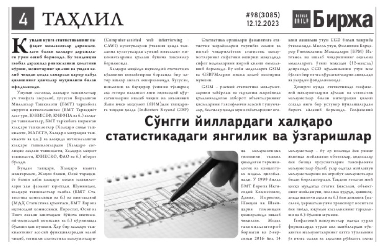 “Birja” gazetasining 2023-yil 12-dekabrdagi 98-sonida Oʻzbekiston Respublikasi Prezidenti huzuridagi Statistika agentligi Xalqaro hamkorlik va axborot almashuv boshqarmasi boshligʻi oʻrinbosari Ulugʻbek Noipovning “Soʻnggi yillardagi xalqaro statistikadagi yangilik va oʻzgarishlar” nomli maqolasi chop etildi