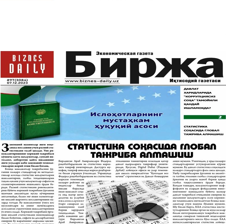 “Биржа” gazetasining 2023-yil 7-dekabrdagi 97-sonida Oʻzbekiston Respublikasi Prezidenti huzuridagi Statistika agentligining Ijtimoiy soha va barqaror rivojlanish statistikasi boshqarmasi boshligʻi o‘rinbosari Jahongir Qambarovning “Statistika sohasida global tajriba almashish” nomli maqolasi chop etildi